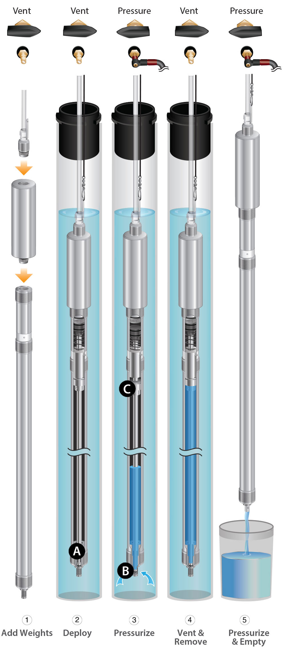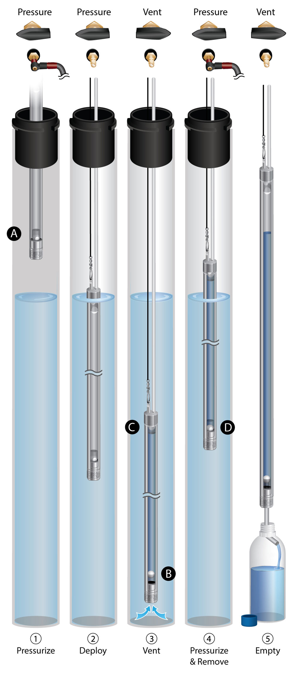 5. Dopo la raccolta del campione, la pressione viene rilasciata dal campionatore, e l’asta del pistone, che sigilla la valvola di rilascio e il foro di sfiato ritorna in posizione e sigilla il sistema.