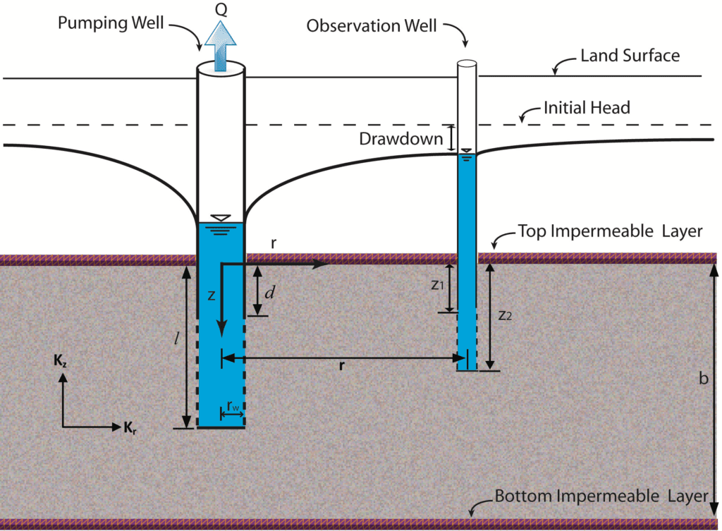 Theis, C. V., 1935. The relation between the lowering of the piezometric surface and the rate and duration of discharge of a well using groundwater storage. American Geophysical Union Trans., vol. 16, pp. 519-524.